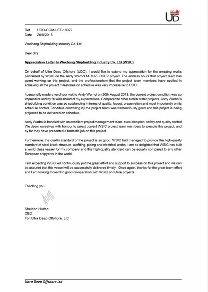 近日,特發(fā)來表揚信以表達對武船的認(rèn)可及感謝。