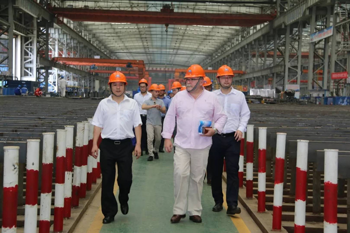儀式后田軍帶領艾米力?杜等一行參觀雙柳武船分段車間