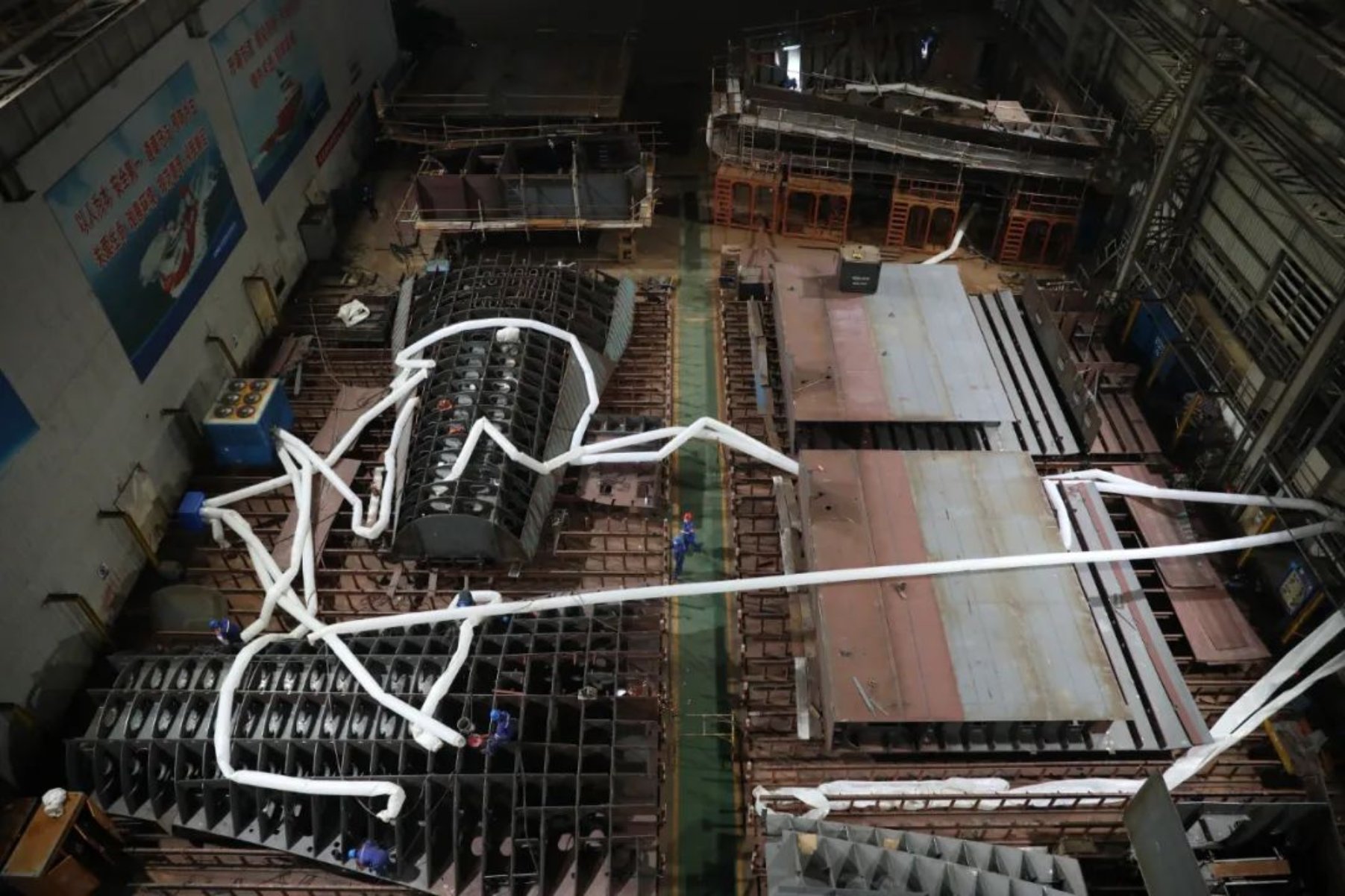 希臘1100箱集裝箱船1號船總工藝師安志杰表示:“分段部結合船型特點和現有設施,以提升效率為基點,和設計人員聯動,通過提前謀劃、高效焊接、舾裝前移、即刻溝通等措施,實現了分段高效制造和完整轉序,確保了后續建造周期。”