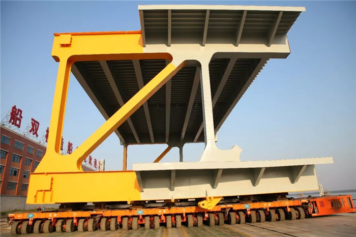 上午10時(shí),首節(jié)鋼桁梁經(jīng)過完整報(bào)檢,駐場(chǎng)監(jiān)理確認(rèn)后,由56軸線并聯(lián)的模塊車緩緩頂起,轉(zhuǎn)運(yùn)到斜船架指定位置。