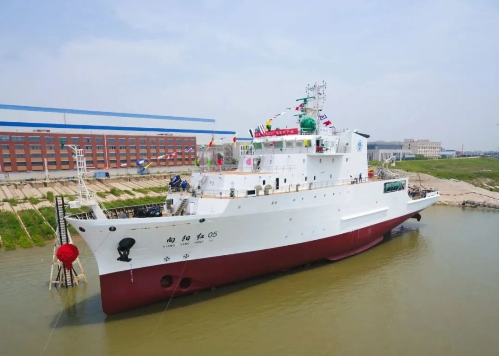 5月19日武昌造船下水滑道,彩旗招展,鑼鼓喧天,鞭炮齊鳴,9點58分,隨著船舶揭幕,擲瓶禮的完成,在眾人的觀禮中,中國船舶集團武昌造船為國家海洋局南海調查中心改造的3000噸級綜合科學考察船——“向陽紅05”船在雙柳廠區成功下水!