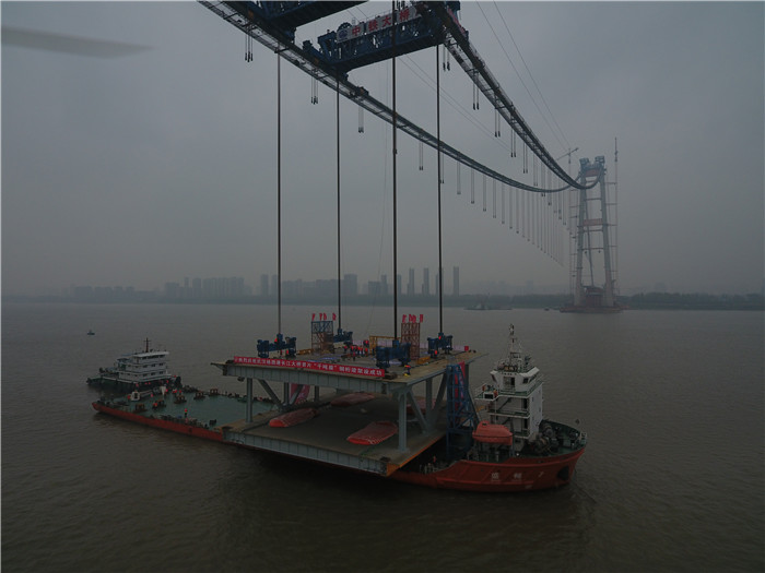 11月15日,由武船集團(tuán)制造的國(guó)內(nèi)首座跨長(zhǎng)江雙層公路懸索橋――武漢楊泗港長(zhǎng)江大橋首個(gè)鋼桁梁節(jié)段吊裝成功。