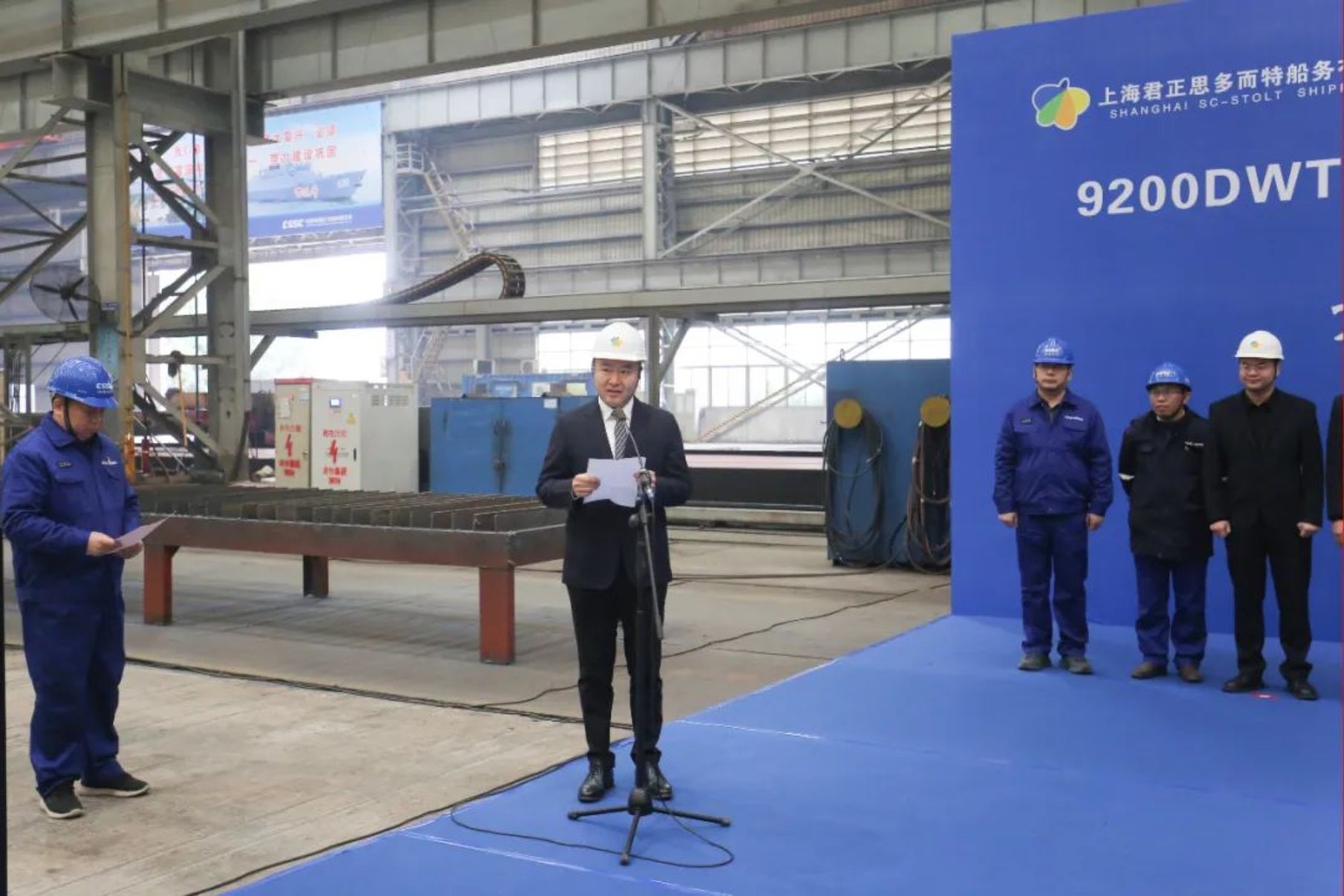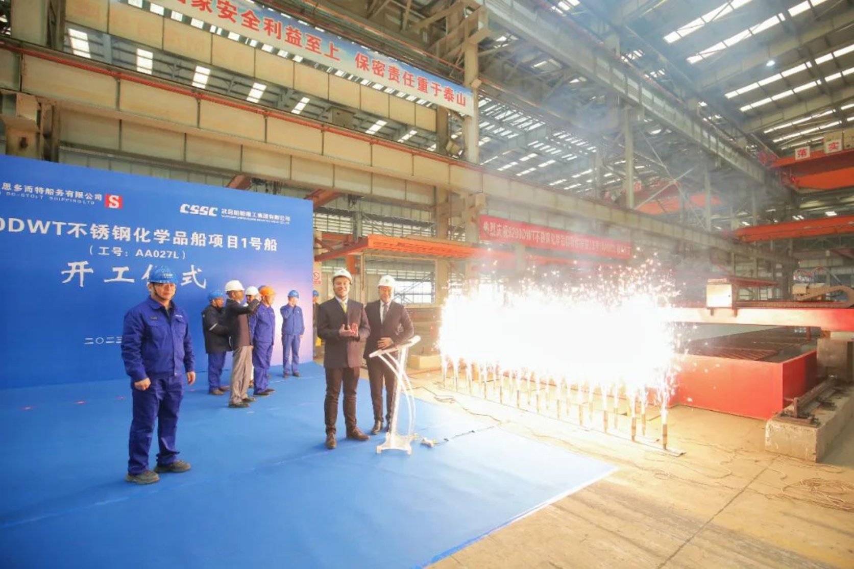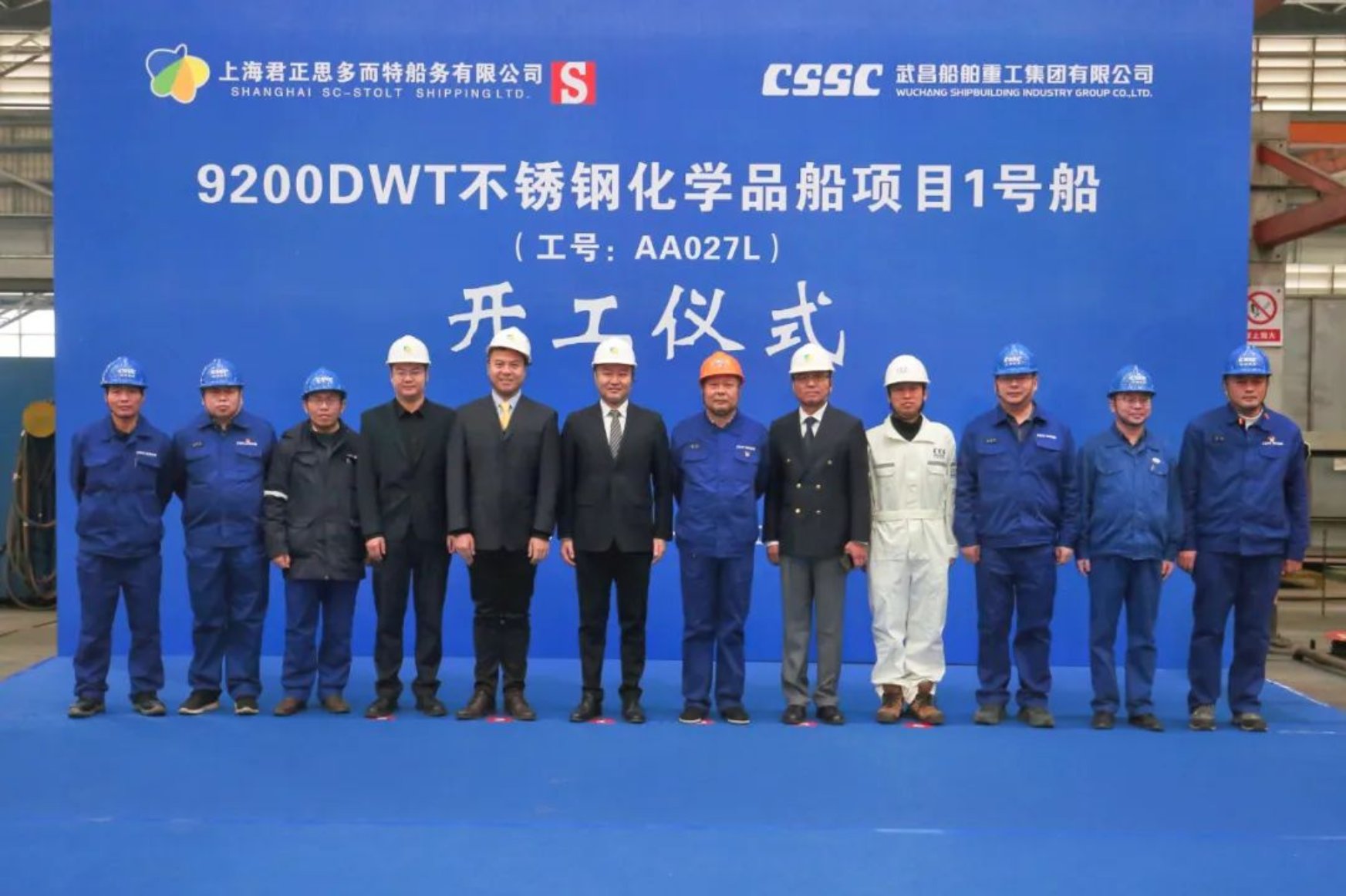 11月15日11點18分,由中國船舶集團武昌造船為上海君正思多而特船務(wù)有限公司建造的 9200DWT不銹鋼化學品船1號船 正式開工。上海君正思多而特船務(wù)有限公司總經(jīng)理張華、副總經(jīng)理鄭翼杰及現(xiàn)場監(jiān)造團隊、中國船級社武漢分社、武昌造船等相關(guān)單位負責人參加開工儀式。