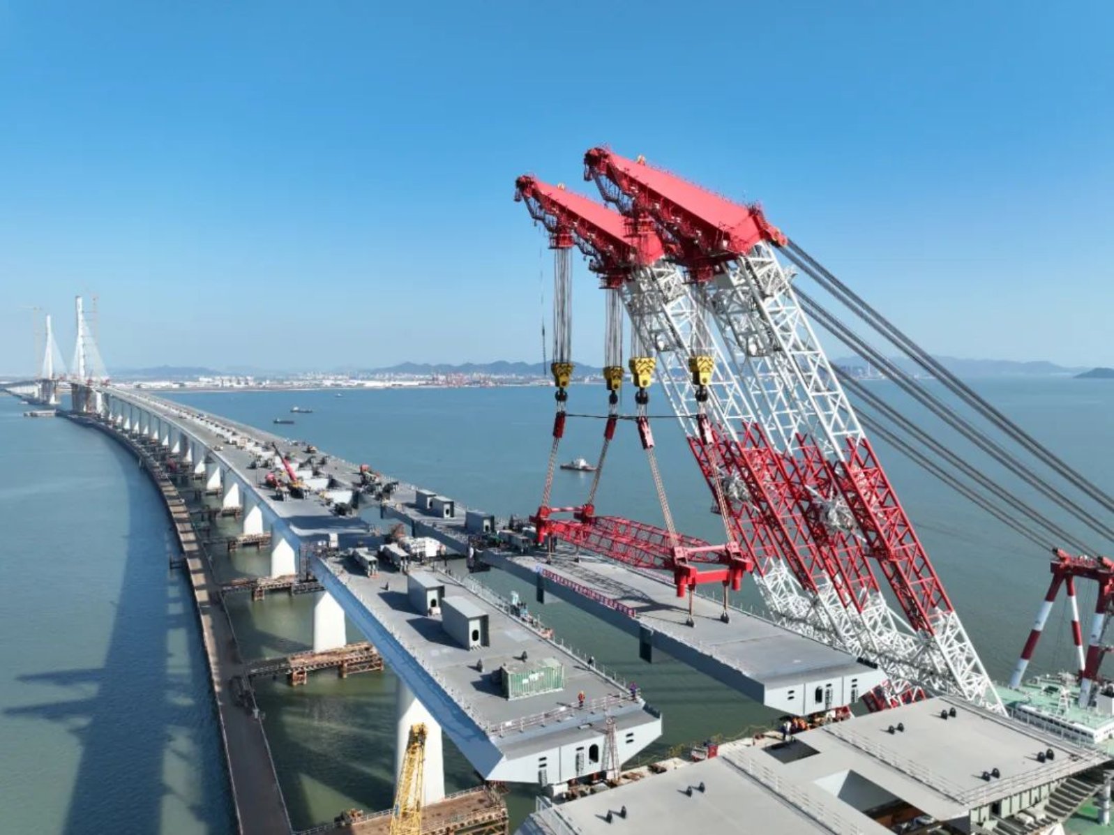 黃茅海跨海通道中引橋設計為左右幅分離的鋼箱連續梁橋,鋼箱梁大節段共32節,最大節段長123米、寬18.75米、高4米、重1340噸。