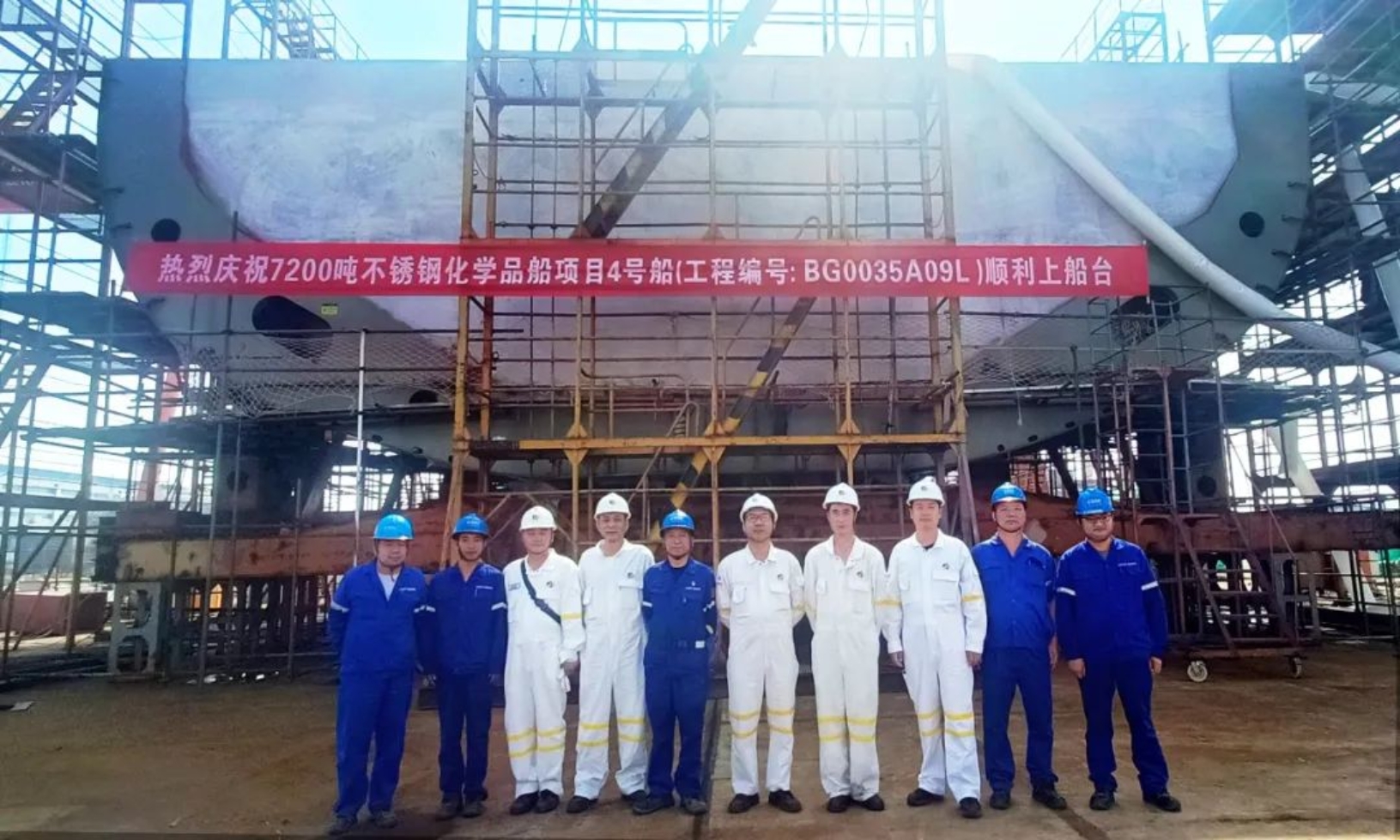 5月25日,由武昌造船建造的7200DWT化學品船4號船順利完成上船臺節點,標志著該船正式進入船臺總組合攏階段。