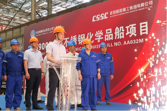 開工儀式上,田軍代表公司對(duì)蒞臨活動(dòng)現(xiàn)場(chǎng)的來賓表示熱烈歡迎并致辭。他表示,興通海運(yùn)是中國(guó)化學(xué)品運(yùn)輸行業(yè)領(lǐng)先的船東,主要從事國(guó)際、國(guó)內(nèi)沿海散裝液體危險(xiǎn)貨物的水上運(yùn)輸業(yè)務(wù)。本項(xiàng)目是雙方第一次合作,武昌造船高度重視。今天的開工標(biāo)志著項(xiàng)目建設(shè)全面鋪開,武昌造船將充分總結(jié)已交付化學(xué)品船的設(shè)計(jì)、建造和管理經(jīng)驗(yàn),與船東、設(shè)計(jì)院、船級(jí)社等參建各方共同努力,精心組織生產(chǎn),確保項(xiàng)目高質(zhì)量按期推進(jìn)。