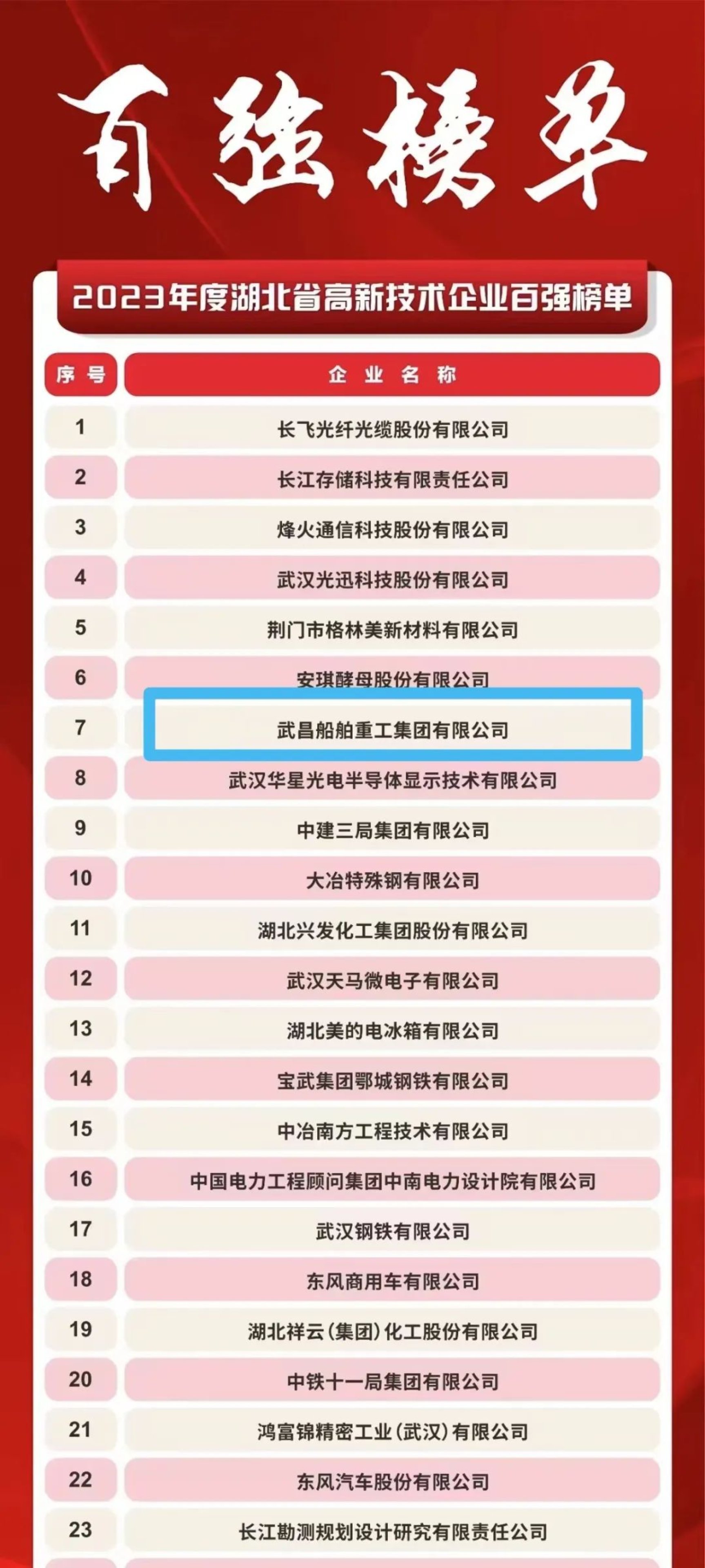 3月7日,湖北省科技廳組織召開(kāi)了2024年湖北省高新技術(shù)企業(yè)“春曉行動(dòng)”啟動(dòng)會(huì),會(huì)上發(fā)布了湖北省2023年度高新技術(shù)企業(yè)百?gòu)?qiáng)名單,中國(guó)船舶集團(tuán)武昌造船繼2022年度后再次上榜,且排名從2022年度的第62名上升至第7名。
